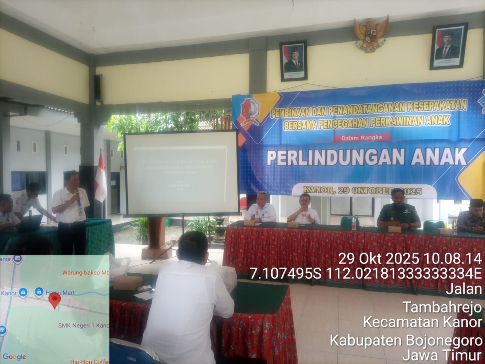 Pada Rabu, 29 Oktober 2025, bertempat di Pendopo Kecamatan Kanor, telah dilaksanakan kegiatan Pembinaan dan Penandatanganan Kesepakatan Bersama Pencegahan Perkawinan Anak dalam rangka Perlindungan Anak di Kabupaten Bojonegoro Tahun 2025.
