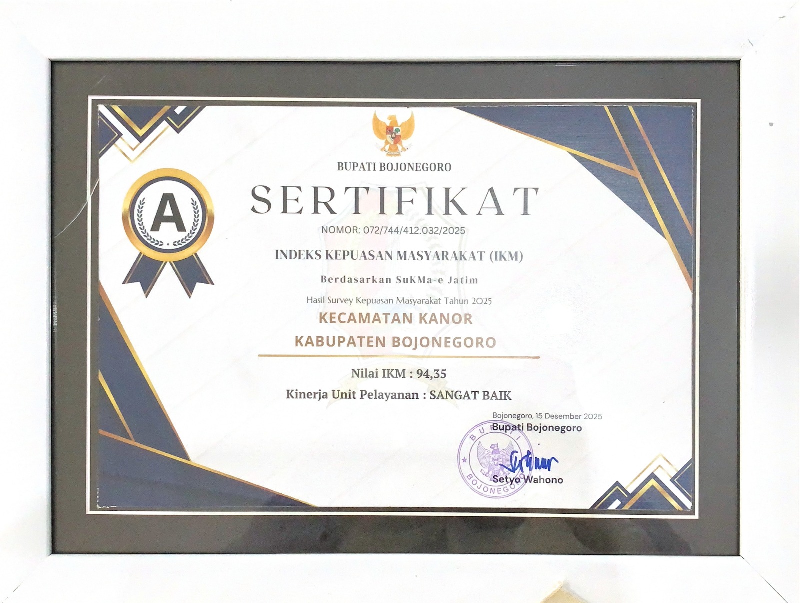 Kanor, 31 Desember 2025 — Kecamatan Kanor Kabupaten Bojonegoro meraih penghargaan Sertifikat Indeks Kepuasan Masyarakat (IKM) Tahun 2025 dengan nilai 94,35 dan kategori Sangat Baik. Penghargaan tersebut diberikan oleh Bupati Bojonegoro dan diserahkan pada saat apel pagi rutin di Kantor Pemerintah Kabupaten Bojonegoro. Camat Kanor menyampaikan terima kasih kepada seluruh warga Kecamatan Kanor atas partisipasi aktif dalam mengisi Survei Kepuasan Masyarakat. Partisipasi masyarakat tersebut menjadi dukungan penting dalam peningkatan kualitas pelayanan publik di Kecamatan Kanor agar semakin baik dan berorientasi pada kepuasan masyarakat.
